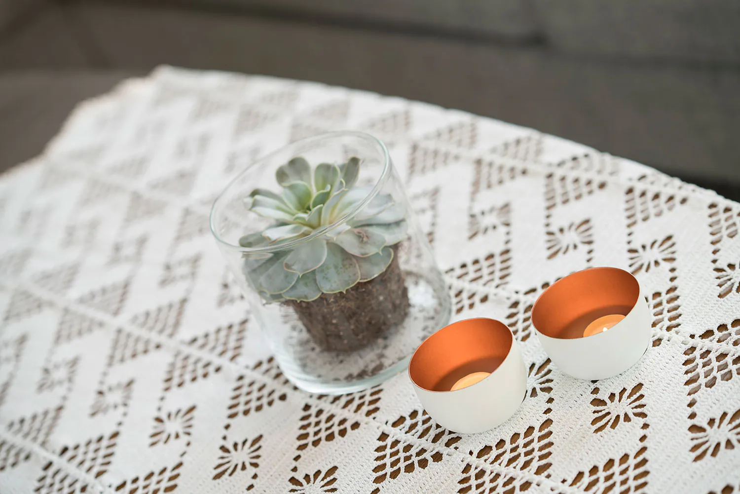 Hekle fra retten, stikk ned i øverste m. ved Imb. (=siste st.), trekk opp 1 m., 2 Im., 1 fm. i neste radskille, x 2 lm., 1 fm. i neste radskille x, gjenta fra x-x langs kortsiden. Hekle rundt hver dbst. (=kantbuene) ved hver rad xx 2 fm. + 1 pkm. + 2 fm. xx, gjenta fra xx-xx langs spissene. Hekle fra x-x langs den siste kortsiden.