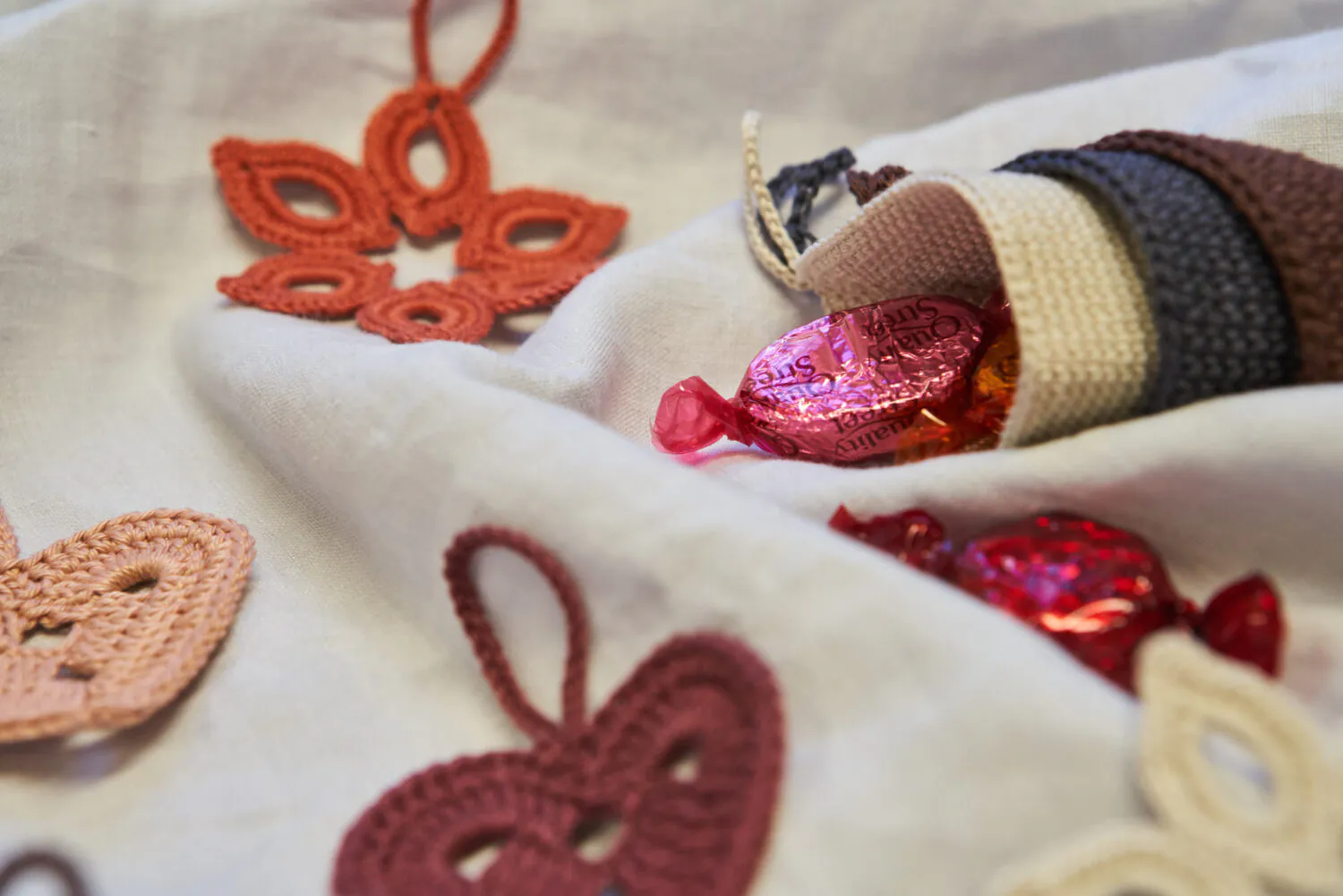 Julepynt som gjør seg både på tre og gaver! Nedenfor finner du oppskrifter på stjerner, kremmerhus og hjerter i aktuelle farger