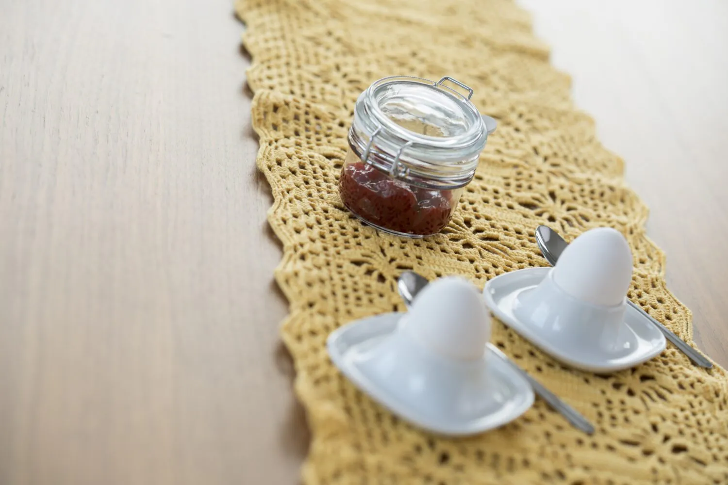 1.rad: Legg opp 86 lm. Stikk nålen i 8. lm. fra nålen og hekle 1 st., 2 lm., hopp over 2 lm., 1 st., 2 lm., hopp over 2 lm., osv. Snu med 5 lm.