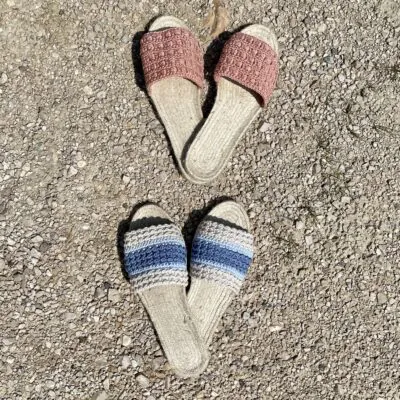 Sandalene er heklet i dobbel tråd Fiol. Du kan velge mellom 42 farger, så det er stor sjanse for at du finner den fargen som passer perfekt til sommerkjolen. Sålene er laget av jute med gummisåle, og det er enkelt å sy fast det heklede overlæret til sålen. Dette er et morsomt og raskt prosjekt som gir mersmak.